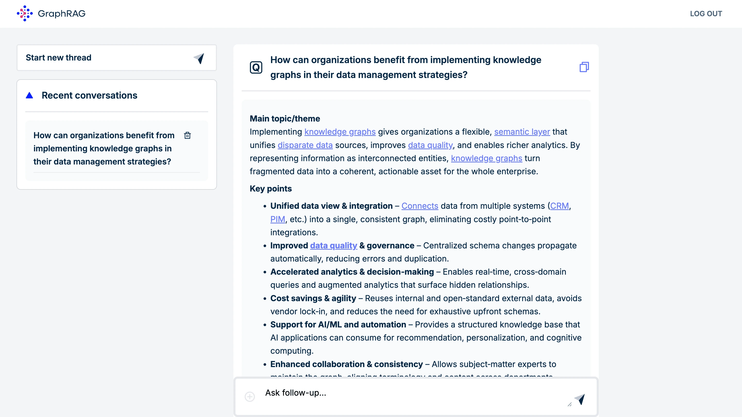 - GraphRAG allows the LLM to navigate any enterprise knowledge like an expert, not a keyword search engine.